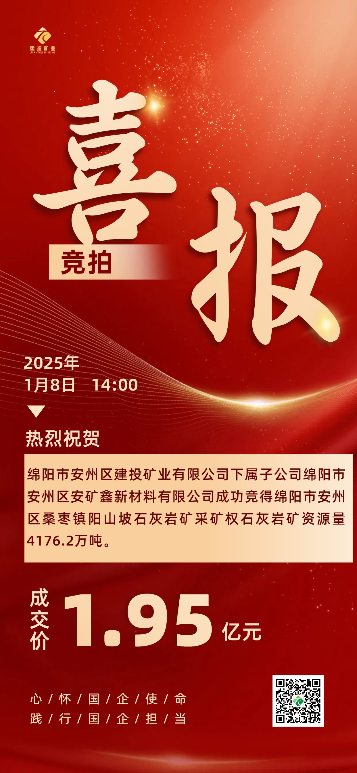 喜報|綿陽安州礦產資源集團有限公司下屬子公司綿陽市安州區安礦鑫新材料有限公司成功競得綿陽市安州區桑棗鎮陽山坡石灰巖礦采礦權