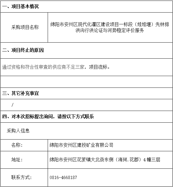 綿陽市安州區現代化灌區建設項目一標段(娃娃堰)先林排洪溝行洪論證與河勢穩定評價服務流標公告